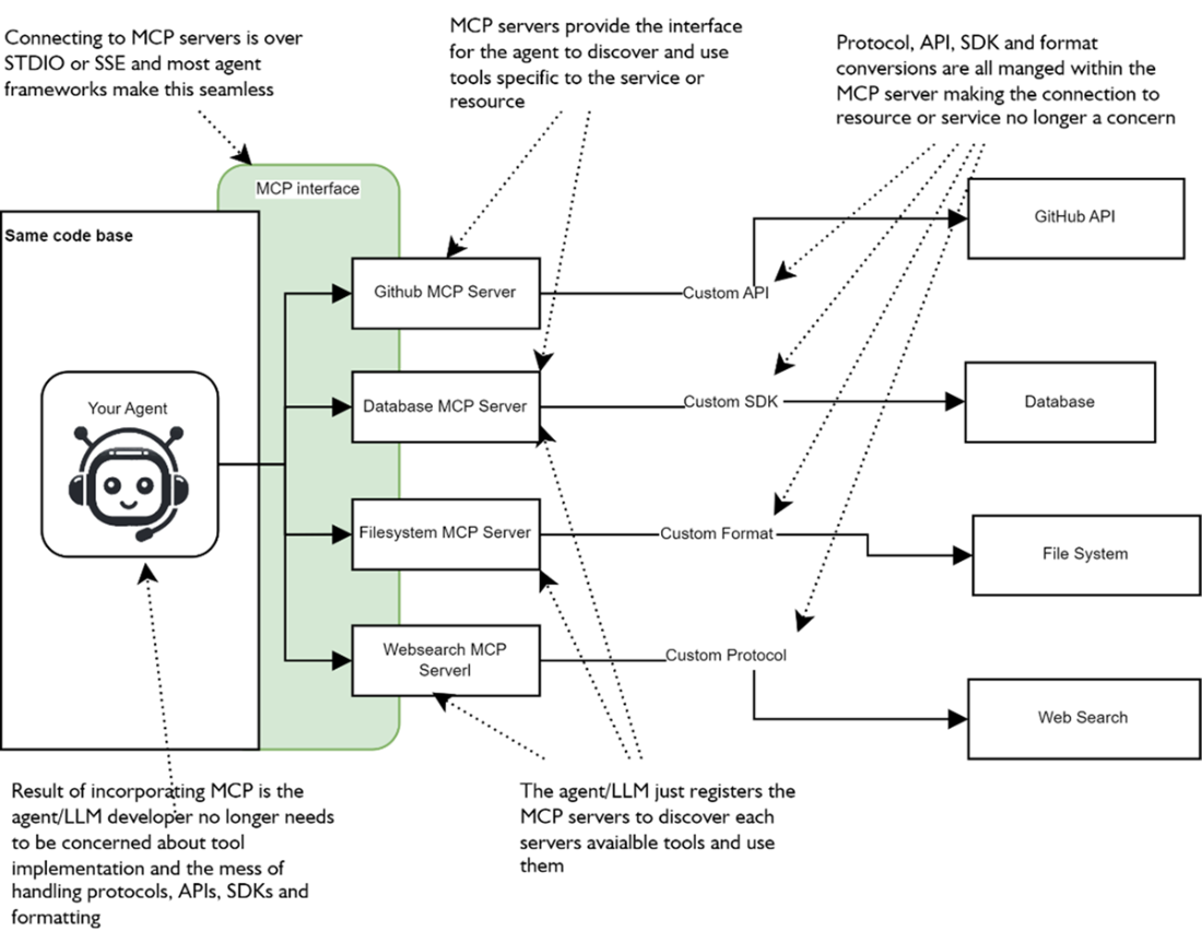 Implementing MCP as a service layer abstracts access to the various services that agent may want to connect to and use.