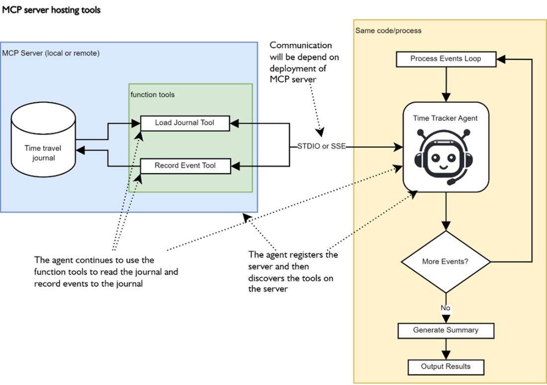 The time tracker agent will record time events using internal function tools as it processes the events in a loop. After the loop finishes the agent is asked to summarize the events and it will use the Load Journal Evants tool to load the journal of events and summarize