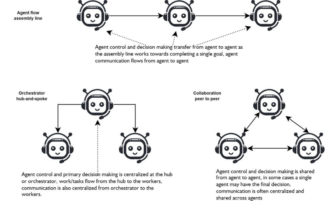 The three well-established patterns for building multiple agent systems, from the agent flow (assembly line), orchestrator (hub-and-spoke), to the collaboration (peer to peer).