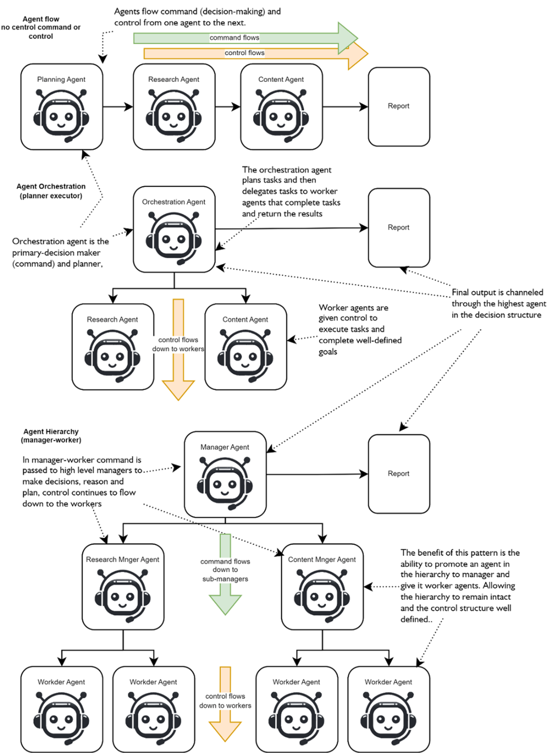Decision-making (command) and control demonstrated for more specialized multi-agent architectures, the flow, orchestration and manager architectures.
