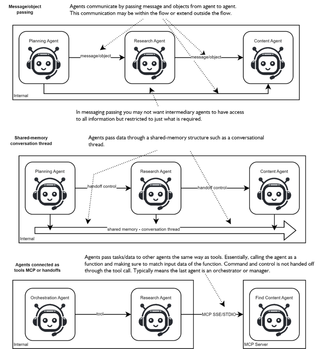 three agent flow communication patterns demonstrating how agents can pass messages from one another and in turn pass command and control from agent to agent.