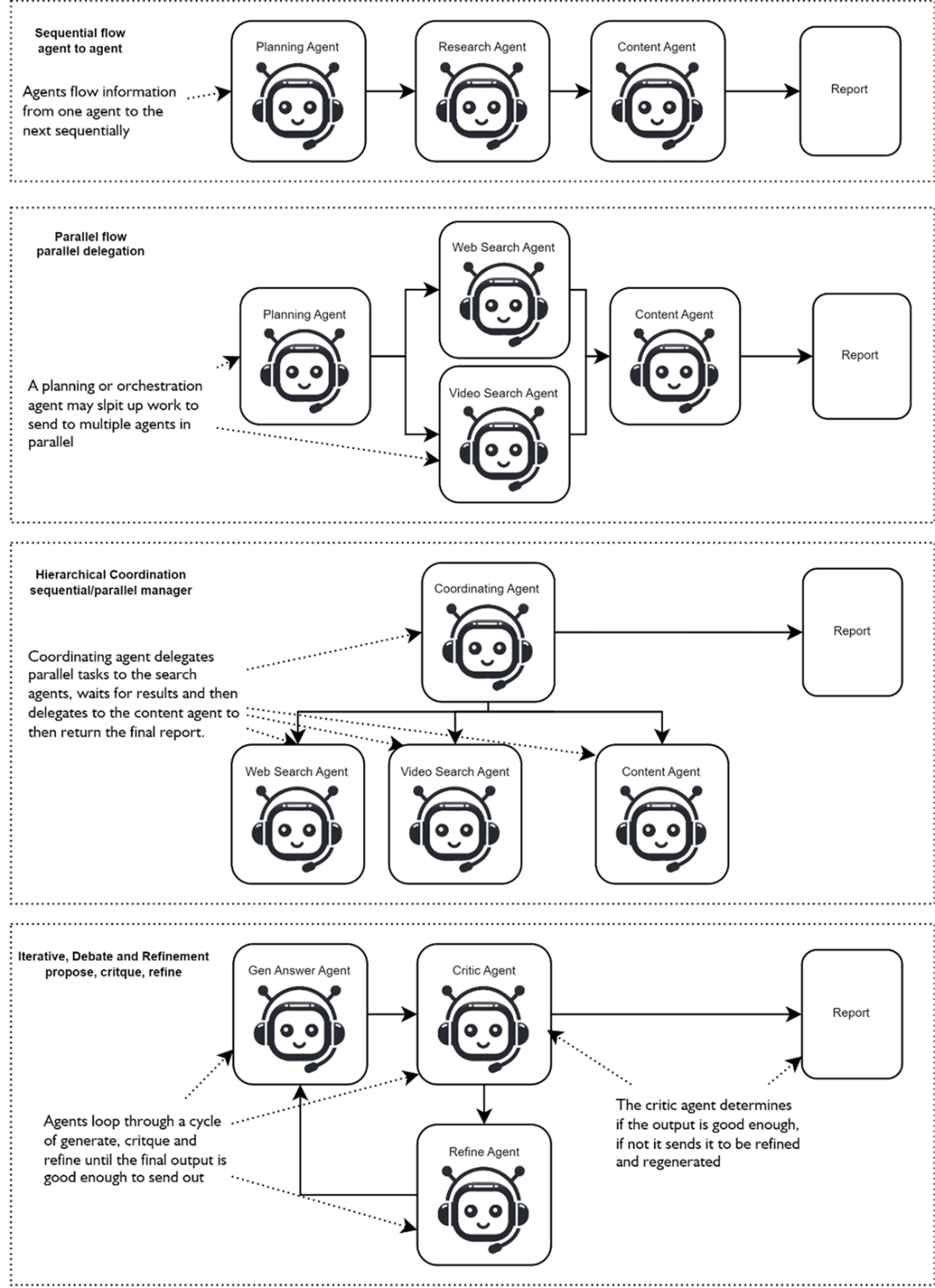 - Iterative debate/refinement: agents critique and improve outputs over rounds for higher quality.