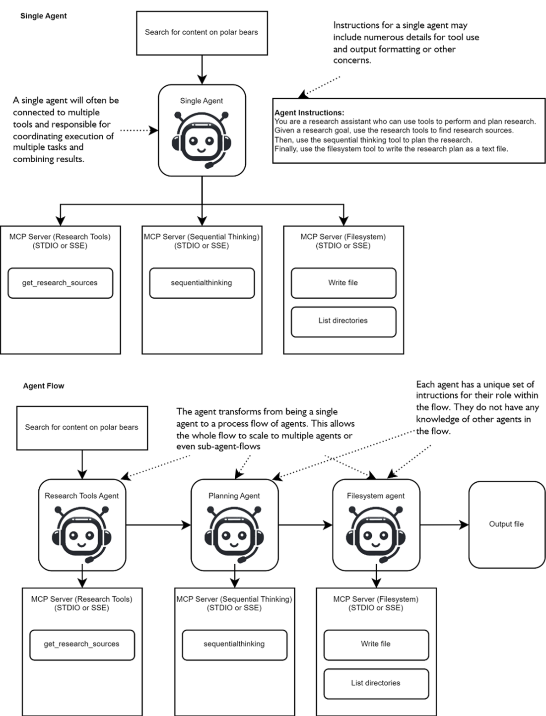 - Agent-to-agent flows work like prompt-chaining with superpowers: each node can invoke tools and reason independently yet pass concise, typed outputs downstream to keep the context lean.