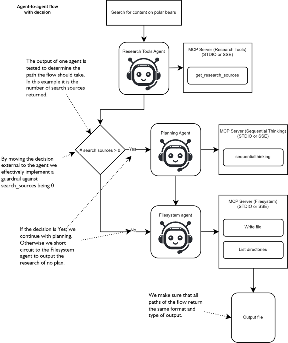 shows an agent-to-agent flow with a deterministic (coded) decision point added. Taking the decision away from the agents and making it deterministic keeps the workflow more consistent.