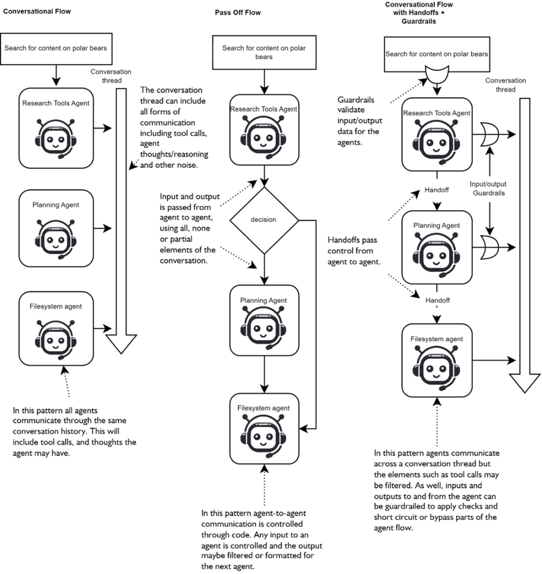 - Pass-off messaging: code passes only the necessary inputs/outputs to the next agent (maximum control, more code).- Shared conversation/memory: all agents see the same thread (easy, but more tokens and possible confusion).