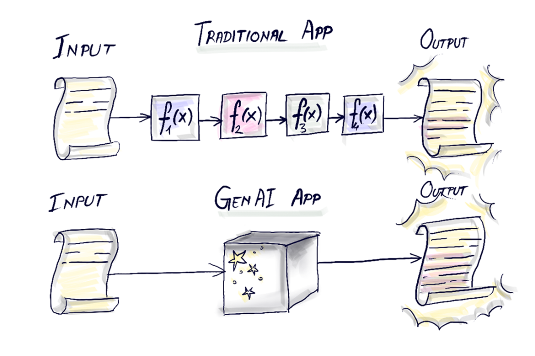 Traditional apps follow explicit, deterministic code paths. GenAI apps route part of the workflow through an LLM—an inherently probabilistic “black box” driven by natural-language prompts. You trade strict control for powerful but non-deterministic behavior and must design around that.Why can’t we predict or fully explain an LLM’s exact output?