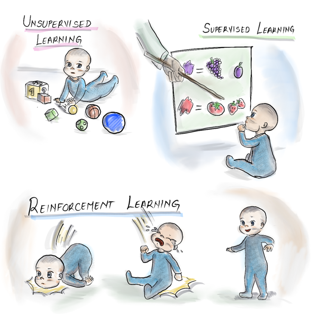 The three types of machine learning: Unsupervised, supervised, and reinforcement.