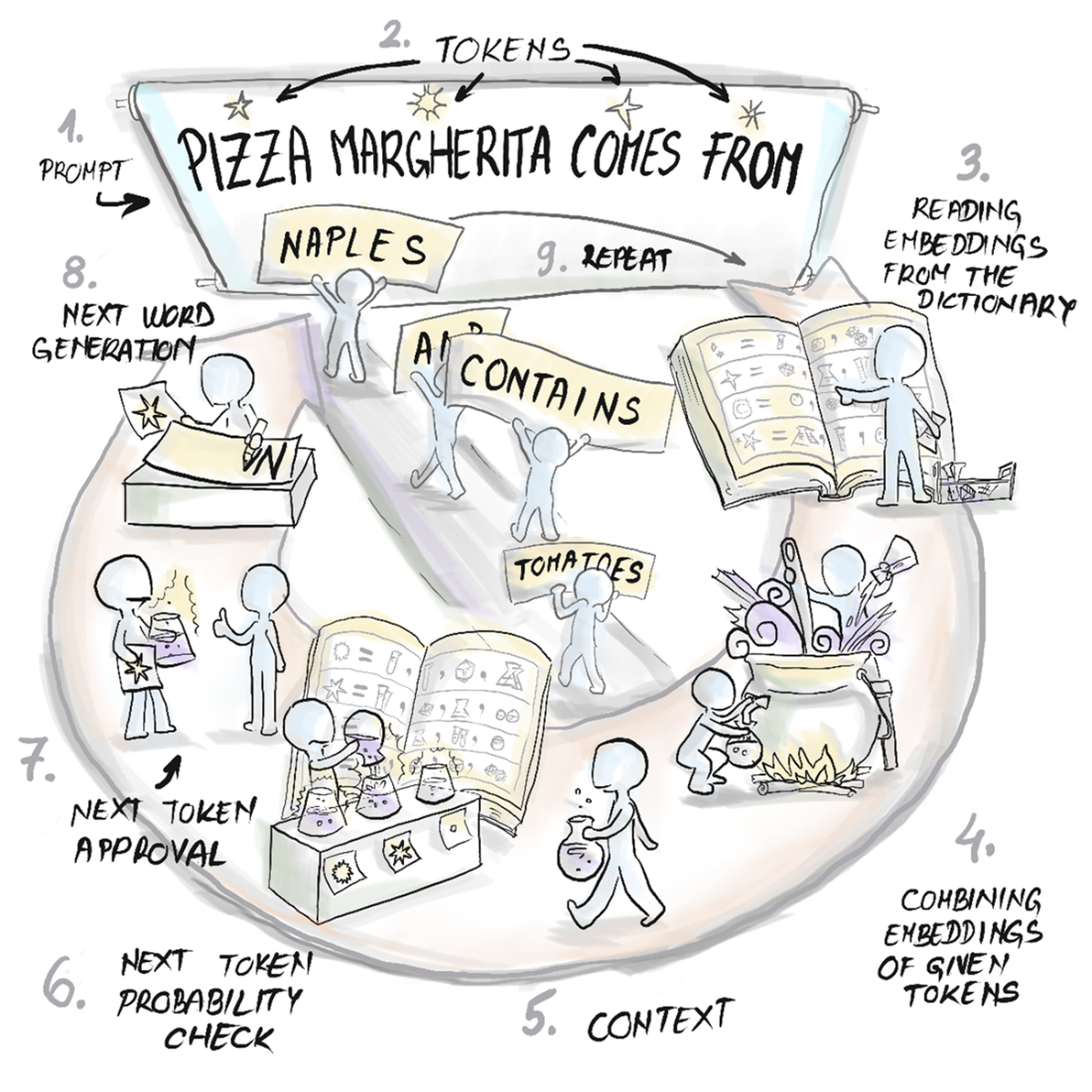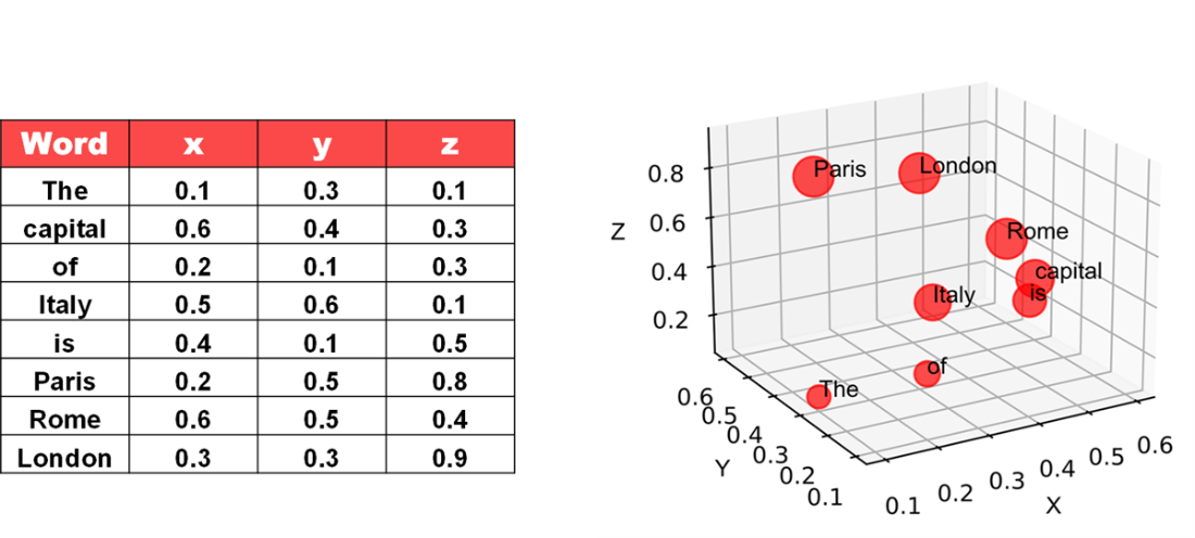 - Tokens: the text units the model reads/writes (words, subwords, punctuation).- Embeddings: numeric vectors capturing token meaning (GPT-3 uses 12,288 numbers per token and ~50k tokens).
