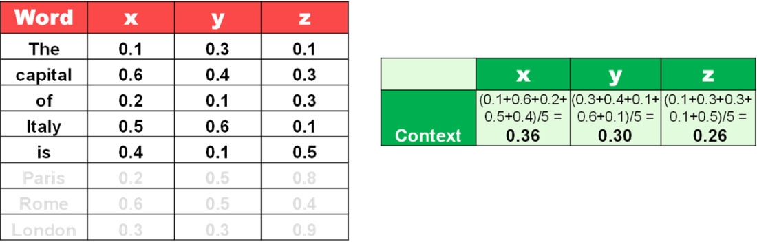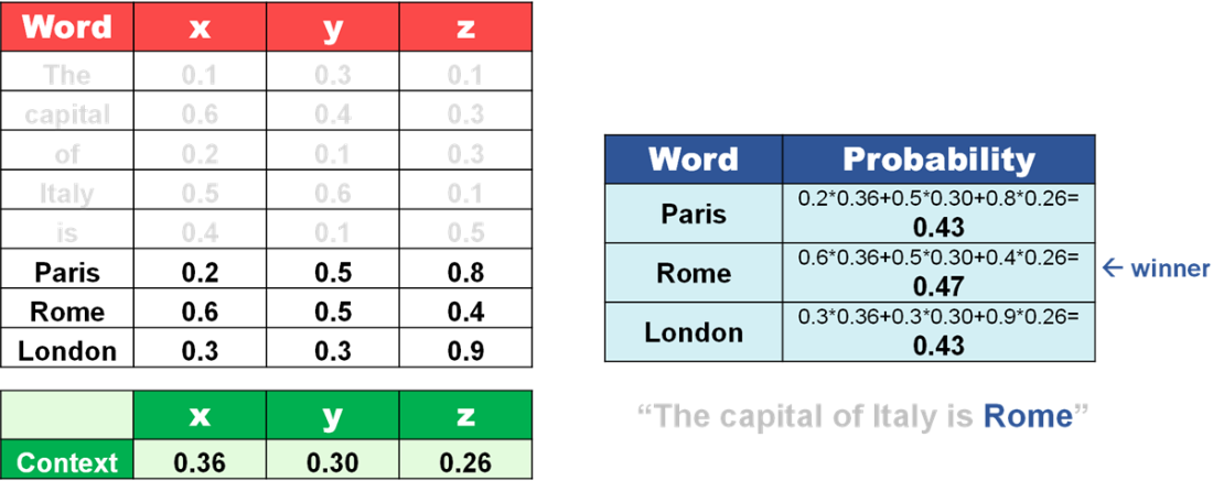 Guess the next best word by combining embeddings with context.