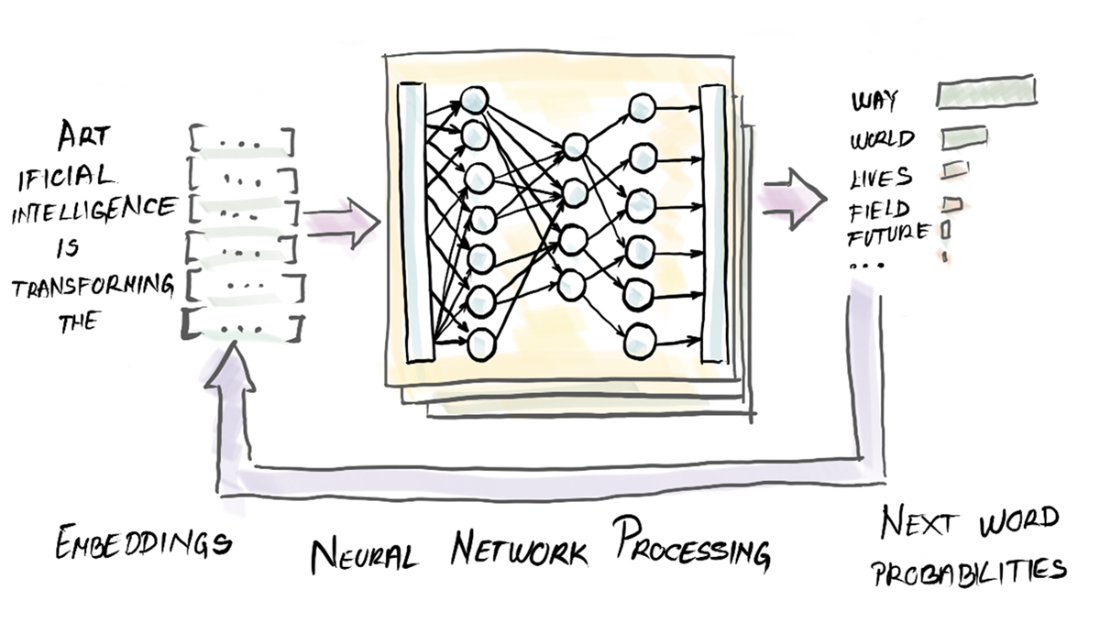 They tokenize input, map tokens to high-dimensional embeddings, compute context with deep transformer networks (attention + position), produce a probability distribution over next tokens, select one, append it, and repeat—building text autoregressively.What are tokens, embeddings, and the context window?