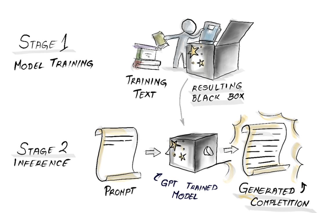 The two stages of GPT-3. First, it gets trained, and then the sentence completion is inferred.