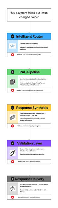 Production reliability comes from layered defenses - routing cuts costs 60-80%, RAG eliminates hallucinations through verified grounding, validation catches errors like the $3,650 in unauthorized gift cards promised to 73 customers.
