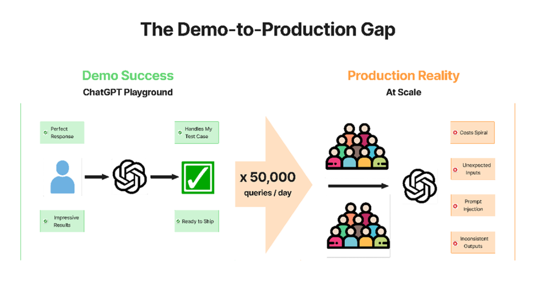 The demo-to-production gap emerges at scale - single-case success fails when serving thousands daily, exposing edge cases, context limits, cost explosions, and security vulnerabilities invisible in testing.