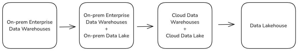 The evolution of data platforms from on-prem warehouses to data lakehouses.
