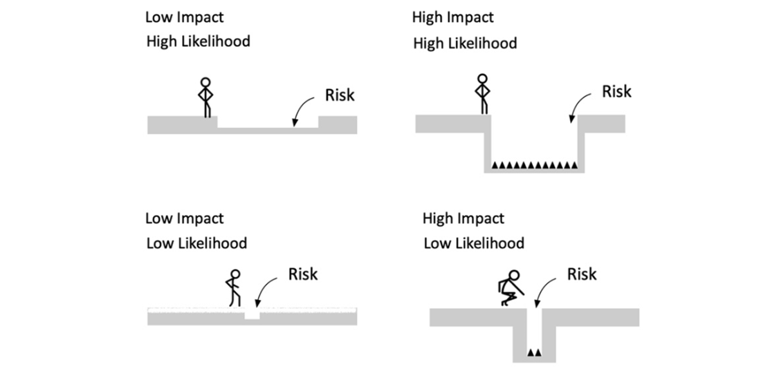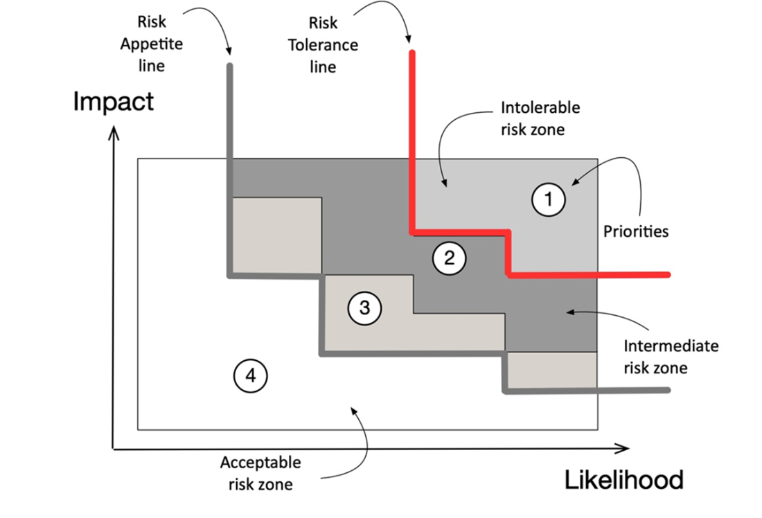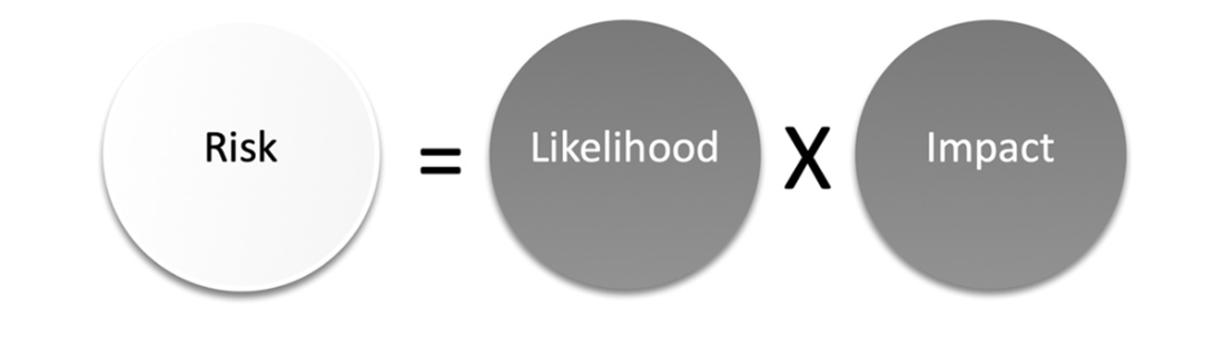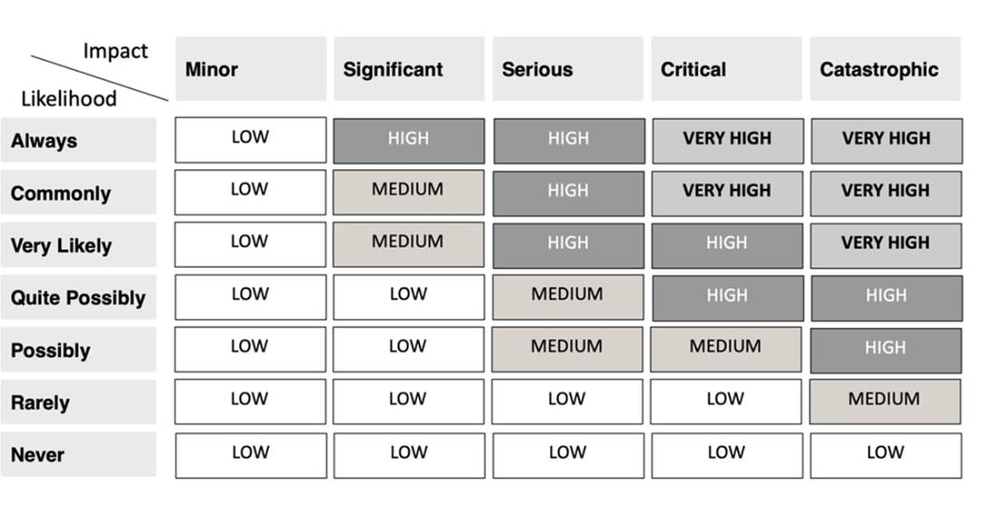 A risk matrix displaying the level of risk as a function of the values of likelihood and impact