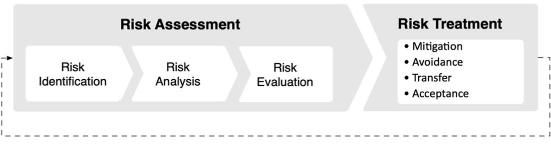 Risk management is presented as an ongoing process with two stages: assessment and treatment. Assessment begins with risk identification, which relies on accurate and regularly updated asset inventories and clear assignment of asset and risk owners. Risk analysis then estimates impact and likelihood using quantitative methods (for example, asset value, exposure factor, single loss expectancy, annualized rate of occurrence, and annualized loss expectancy) or qualitative methods (descriptive scales and a risk matrix), or both. Risk evaluation prioritizes the results, generally breaking ties in favor of higher-impact scenarios and elevating any threat to human safety, so that limited resources address the most consequential risks first.