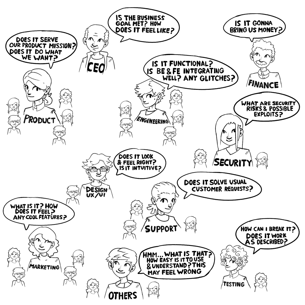 Anyone who cares about the product: engineers, designers, product managers, QA, security, sales, support, leadership, and sometimes select customers. Diverse roles and backgrounds reveal different issues and perspectives.