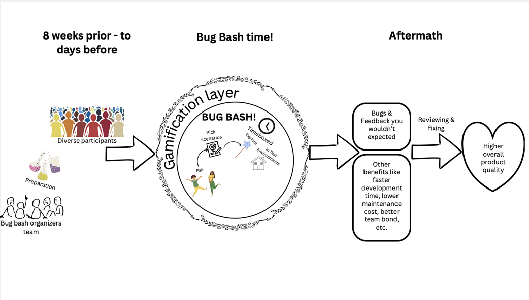 The anatomy of a bug bash. On the left, you see what comes into the bug bash, the middle is the event itself and its aspects, while on the right, there are the outcomes of the event. All this leads to a better quality product. (will be redrawn)
