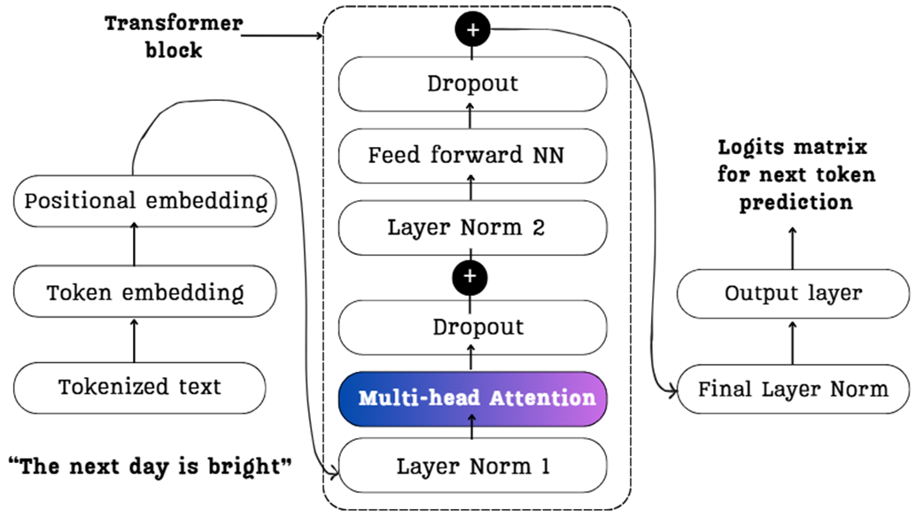A detailed view of a standard Transformer block, the foundational architecture used in models like LLaMA and the GPT series. It is composed of a multi-head attention block and a feed-forward network (NN).