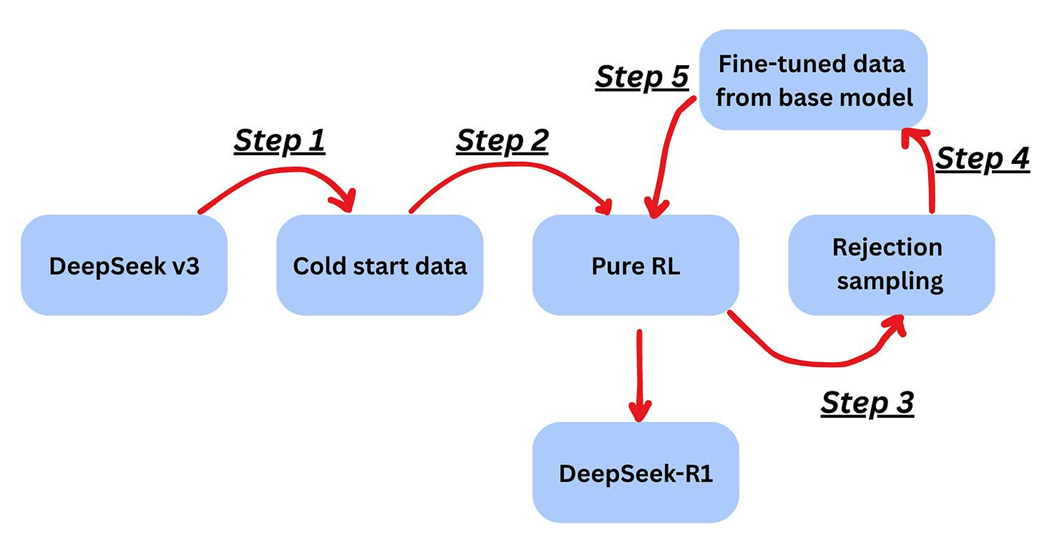 - Step 1 (Foundation): Lightly fine-tune the base model (DeepSeek-V3) with a small “cold-start” dataset.