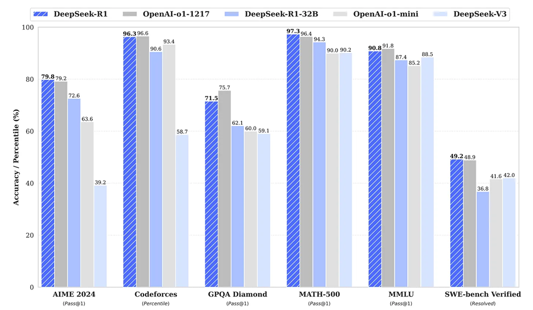 Benchmark performance of DeepSeek-R1 against other leading models (as of January 2025).