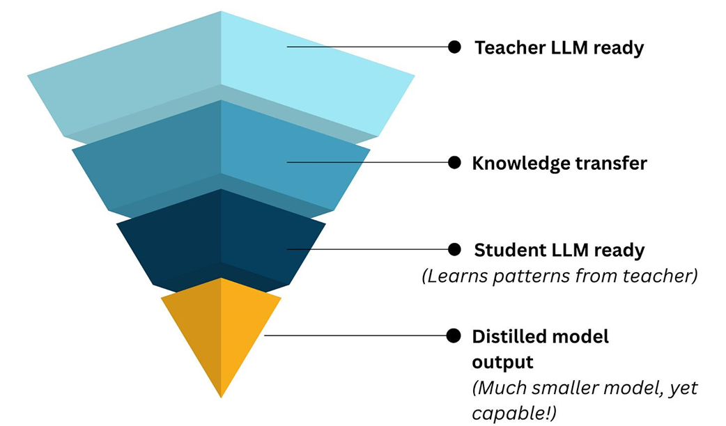 The concept of knowledge distillation. A large, powerful "teacher" model (like DeepSeek-R1) is used to generate training data to teach a much smaller, more efficient "student" model, transferring its capabilities without the high computational cost.