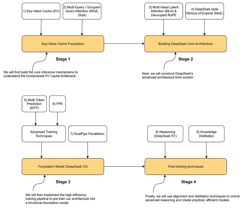 - The core innovations we will implement are divided into four stages: (1) KV Cache Foundation, (2) Core Architecture (MLA & MoE), (3) Advanced Training Techniques (MTP & FP8), and (4) Post-training (RL & Distillation).