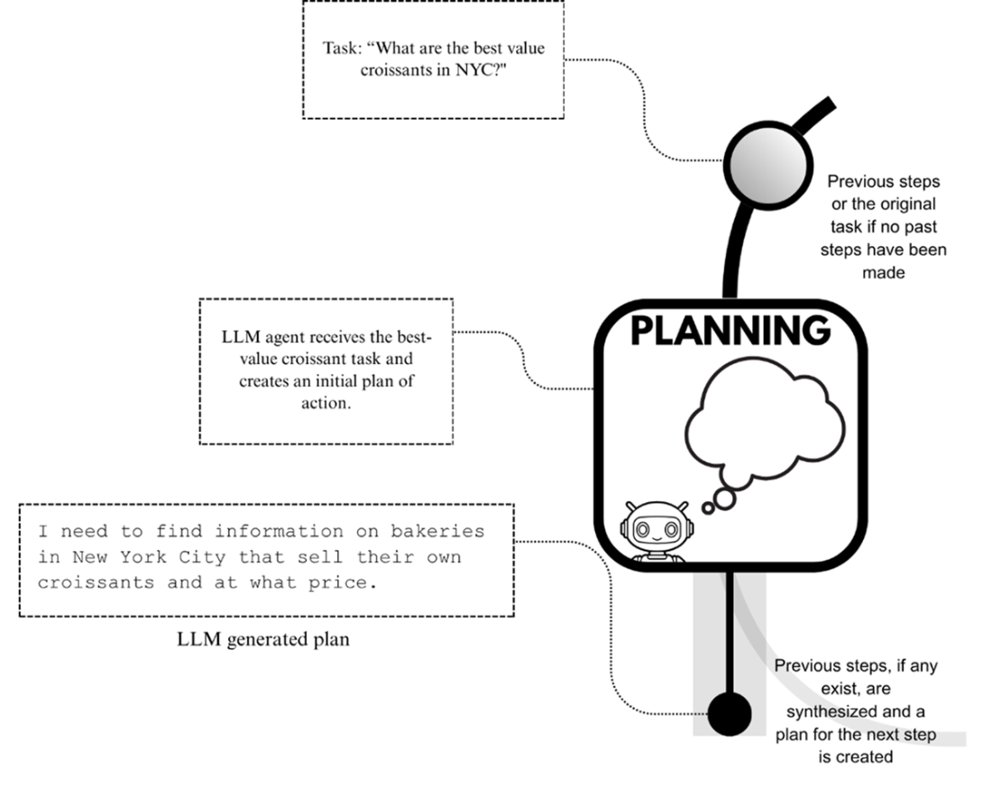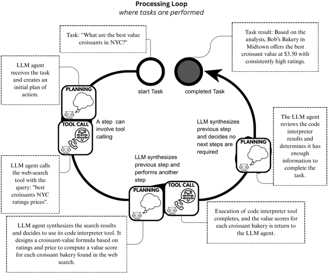 A mental model of an LLM agent performing a task through its processing loop, where tool calling and planning are used repeatedly. The task is executed through a series of sub-steps, a typical approach for performing tasks.