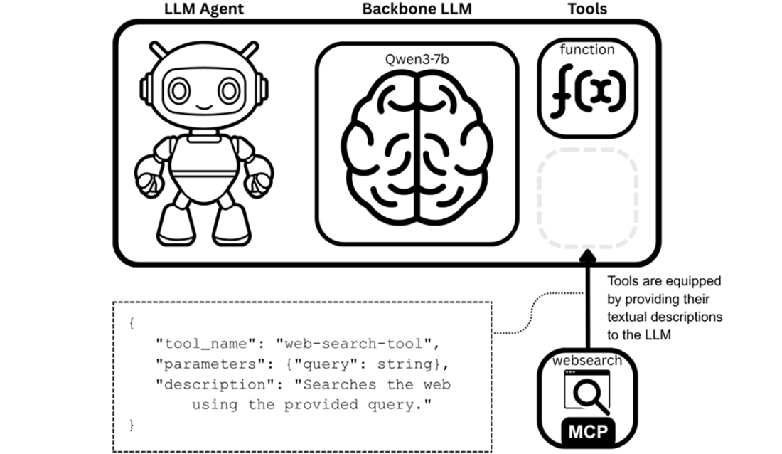 An illustration of the tool-equipping process, where a textual description of the tool that contains the tool’s name, description and its parameters is provided to the LLM agent.