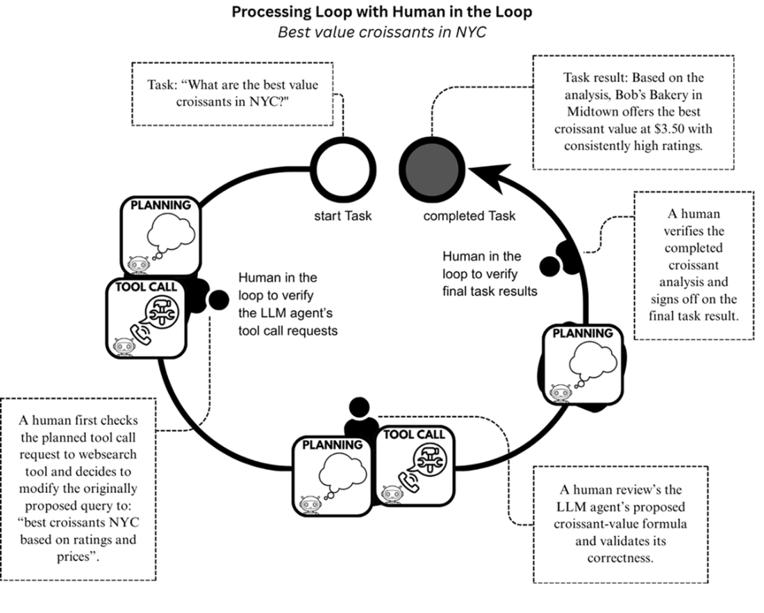 An LLM agent processing loop with access to human operators. The processing loop is effectively paused each time a human operator is required to provide input.