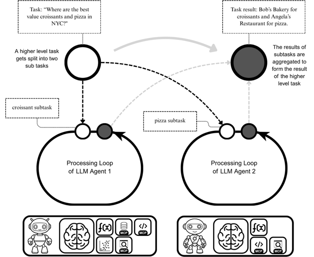 Multiple LLM agents collaborating to complete an overarching task. The outcomes of each LLM agent’s processing loop are combined to form the overall task result.
