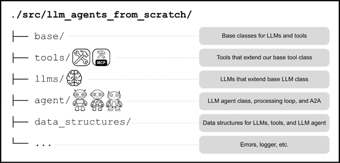 - We’ll build LLM agents, MAS, and all the required infrastructure from scratch into a Python framework called llm-agents-from-scratch.