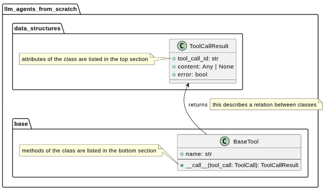 A simple UML class diagram that shows two classes from the llm-agents-from-scratch framework. The BaseTool class lives in the base module, while the ToolCallResult lives in the data_structures module. The attributes and methods of both classes are indicated in their respective class diagrams and the relation between them is also described.