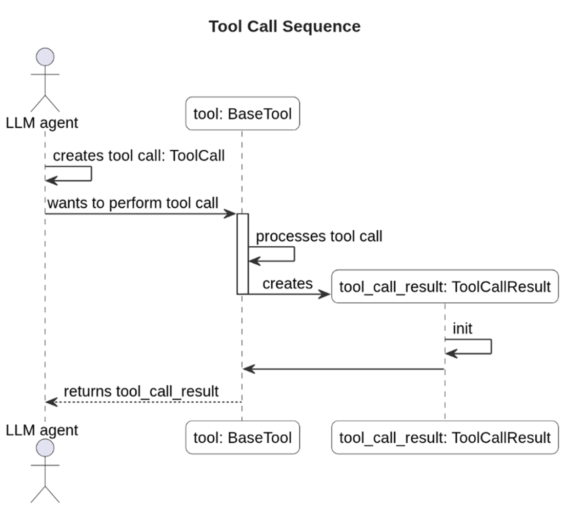 A UML sequence diagram that illustrates how the flow of a tool call. First, an LLM agent prepares a ToolCall object and invokes the BaseTool, which initiates the processing of the tool call. Once completed, the BaseTool class constructs a ToolCallResult which then gets sent back to the LLM agent.