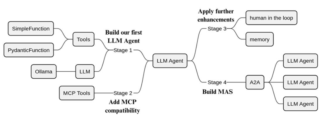 The build plan for our llm-agents-from-scratch framework. We will build this framework in four stages. In the first stage, we’ll implement the interfaces for tools and LLMs, as well as our LLM agent class. In the second stage, we’ll make our LLM agent MCP compatible so that MCP tools can be equipped to the backbone LLM. In stage three, we will implement the human-in-the-loop pattern and add memory modules to our LLM agent. And, in the fourth and final stage, we’ll incorporate A2A and other multi-agent coordination logic into our framework to enable building MAS.