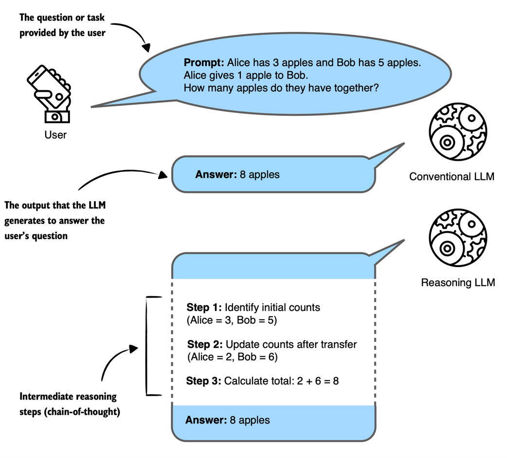 This chapter introduces reasoning as the next stage in large language models, defining it as the practice of making intermediate steps explicit before delivering an answer. Often called chain-of-thought, this behavior can boost accuracy on complex tasks, but it remains fundamentally probabilistic: models generate token by token based on patterns learned during training rather than executing guaranteed, rule-based logic. The book takes a hands-on, code-first approach aimed at engineers and researchers, focusing on how to implement and evaluate practical reasoning methods from scratch rather than debating philosophical definitions.