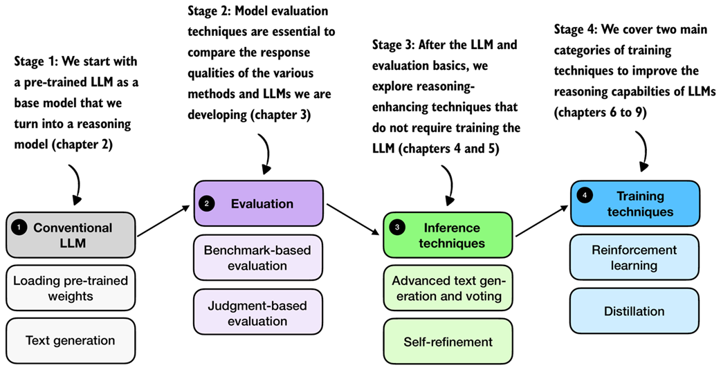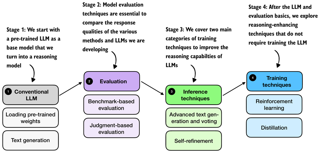 A mental model of the main reasoning model development stages covered in this book. We start with a conventional LLM as base model (stage 1). In stage 2, we cover evaluation strategies to track the reasoning improvements introduced via the reasoning methods in stages 3 and 4.