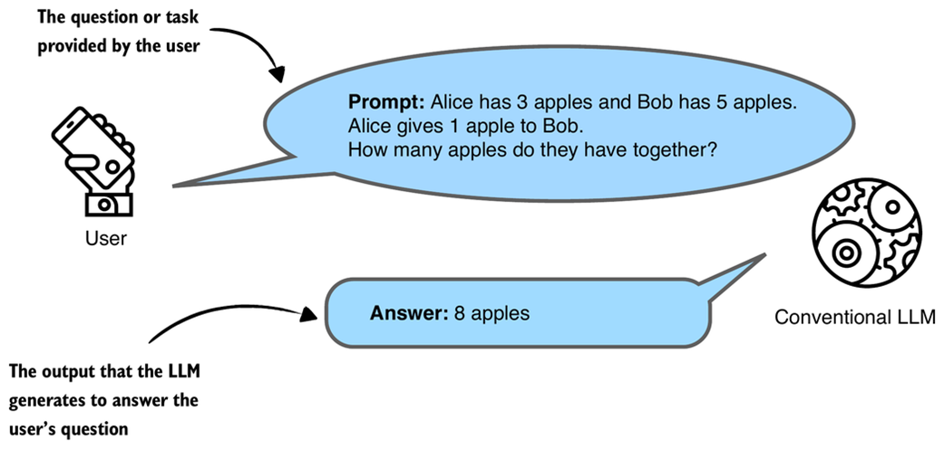 A simplified illustration of how a conventional, non-reasoning LLM might respond to a question with a short answer.