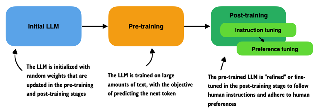 Overview of a typical LLM training pipeline. The process begins with an initial model initialized with random weights, followed by pre-training on large-scale text data to learn language patterns by predicting the next token. Post-training then refines the model through instruction fine-tuning and preference fine-tuning, which enables the LLM to follow human instructions better and align with human preferences.