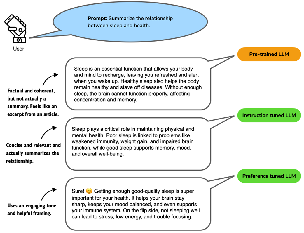 Example responses from a language model at different training stages. The prompt asks for a summary of the relationship between sleep and health. The pre-trained LLM produces a relevant but unfocused answer without directly following the instructions. The instruction-tuned LLM generates a concise and accurate summary aligned with the prompt. The preference-tuned LLM further improves the response by using a friendly tone and engaging language, which makes the answer more relatable and user-centered.
