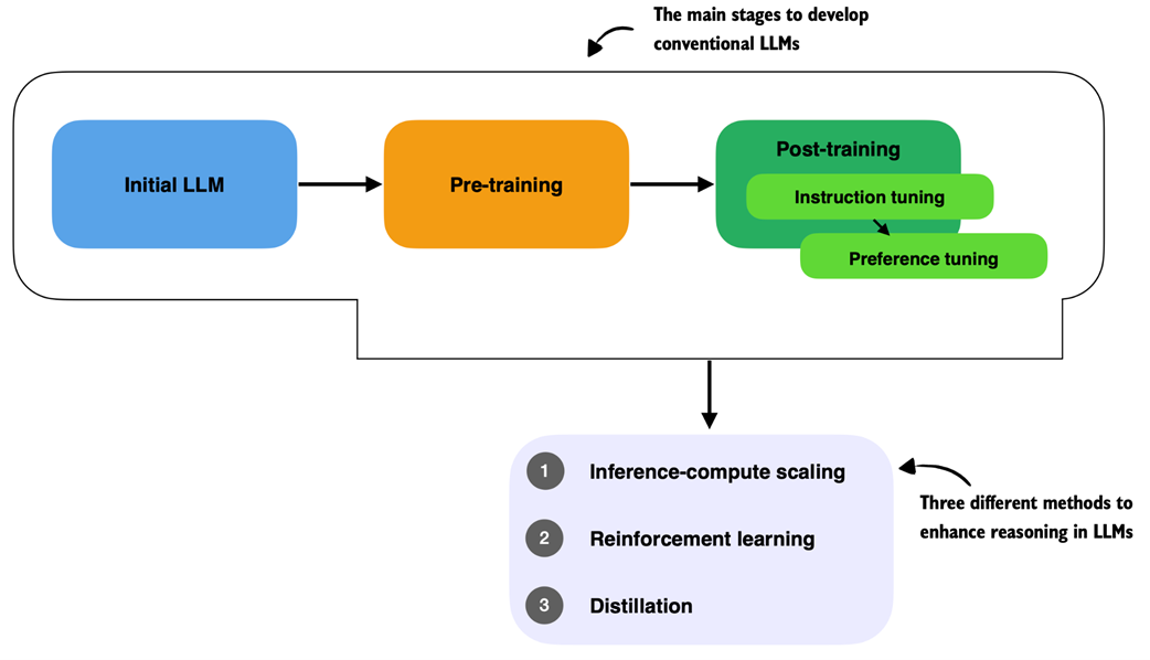 Three approaches commonly used to improve reasoning capabilities in LLMs. These methods (inference-compute scaling, reinforcement learning, and distillation) are typically applied after the conventional training stages (initial model training, pre-training, and post-training with instruction and preference tuning).