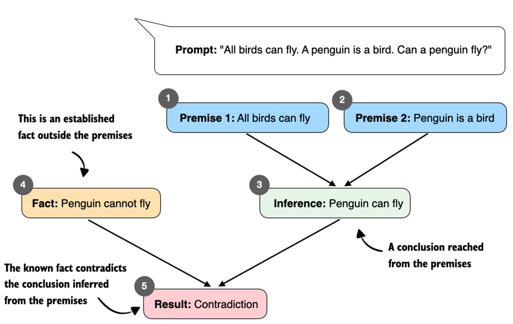 Illustration of how contradictory premises lead to a logical inconsistency. From "All birds can fly" and "A penguin is a bird," we infer "Penguin can fly." This conclusion conflicts with the established fact "Penguin cannot fly," which results in a contradiction.