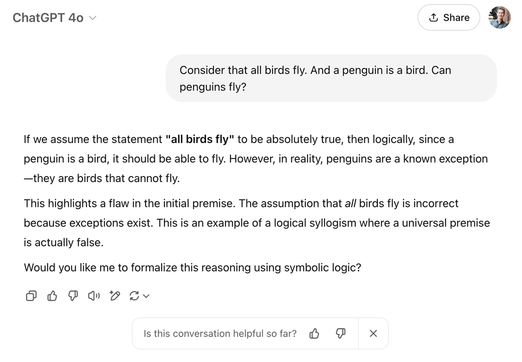 An illustrative example of how a language model (GPT-4o in ChatGPT) appears to "reason" about a contradictory premise.