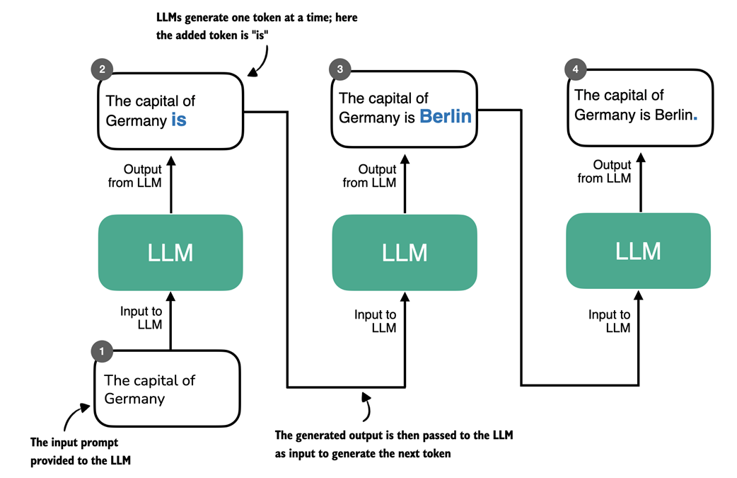 Token-by-token generation in an LLM. At each step, the LLM takes the full sequence generated so far and predicts the next token, which may represent a word, subword, or punctuation mark depending on the tokenizer. The newly generated token is appended to the sequence and used as input for the next step. This iterative decoding process is used in both standard language models and reasoning-focused models.