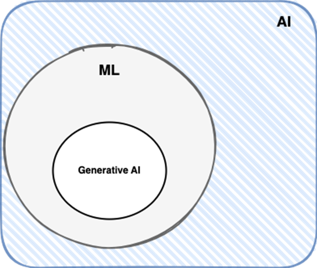This image shows the relationship between "generative" AI, machine learning (ML), and traditional AI.