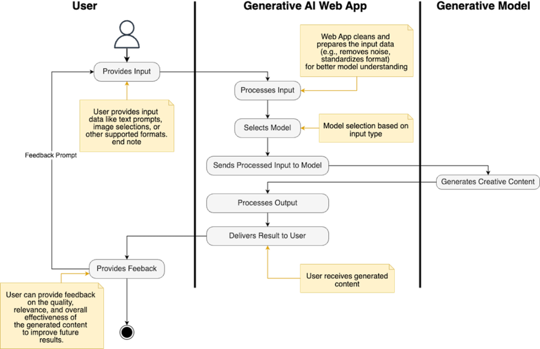 How an AI web app works: users input data, the app processes it, selects a model, generates content, delivers it, and optionally collects feedback.