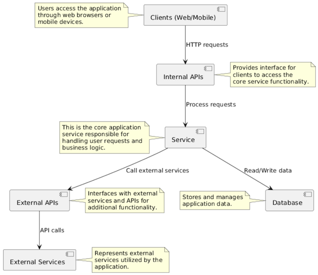 Simplified architecture diagram of a web application ecosystem. Clients, including web browsers and mobile devices, interact with the core application service, which handles user requests and business logic. The service interacts with a database to store and manage application data. Additionally, the service communicates with external APIs to access additional functionality and interacts with external services utilized by the application.