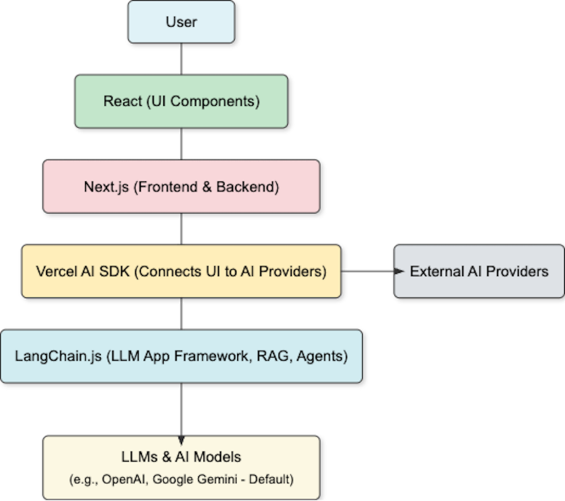 - The apps we build in this book will use JavaScript and React to display the UI interface components, along with Next.js and the Vercel AI SDK to manage the backend and interact with external AI service providers.