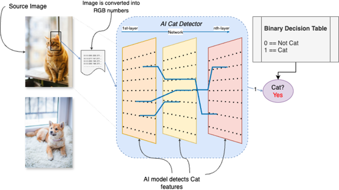 How AI can be used to detect whether a picture of a cat is a cat or not. It accepts an image as input and responds with yes or no (or 0 and 1).