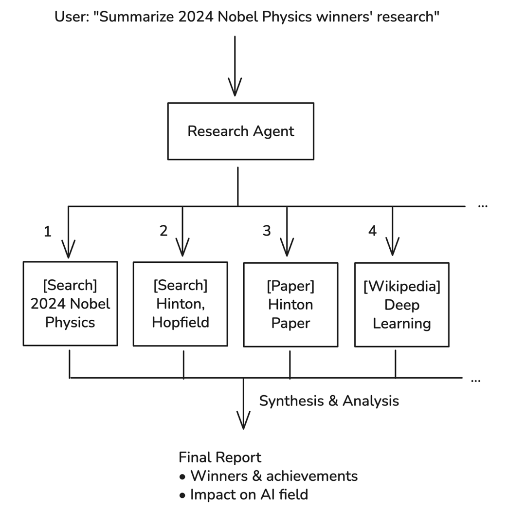 User requests flow through the research agent, which branches into multiple searches and synthesis.
